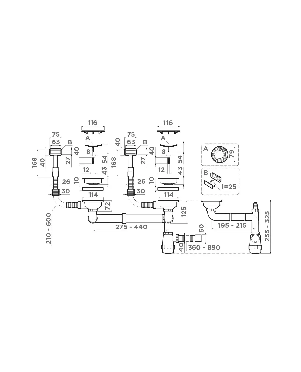 - Арматура для двухчашевых моек с прямоугольными переливами, декоративными решетками и декоративными накладками.