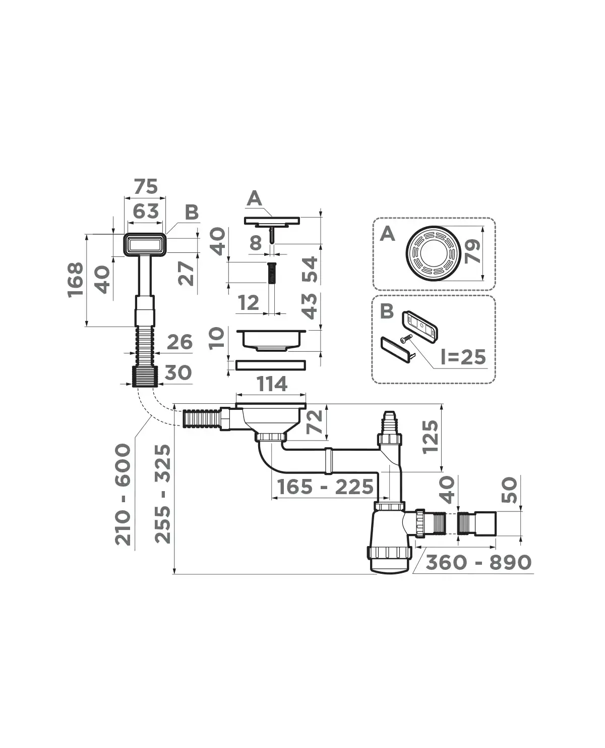 - Арматура для одночашевых моек с прямоугольным переливом и декоративной решеткой.