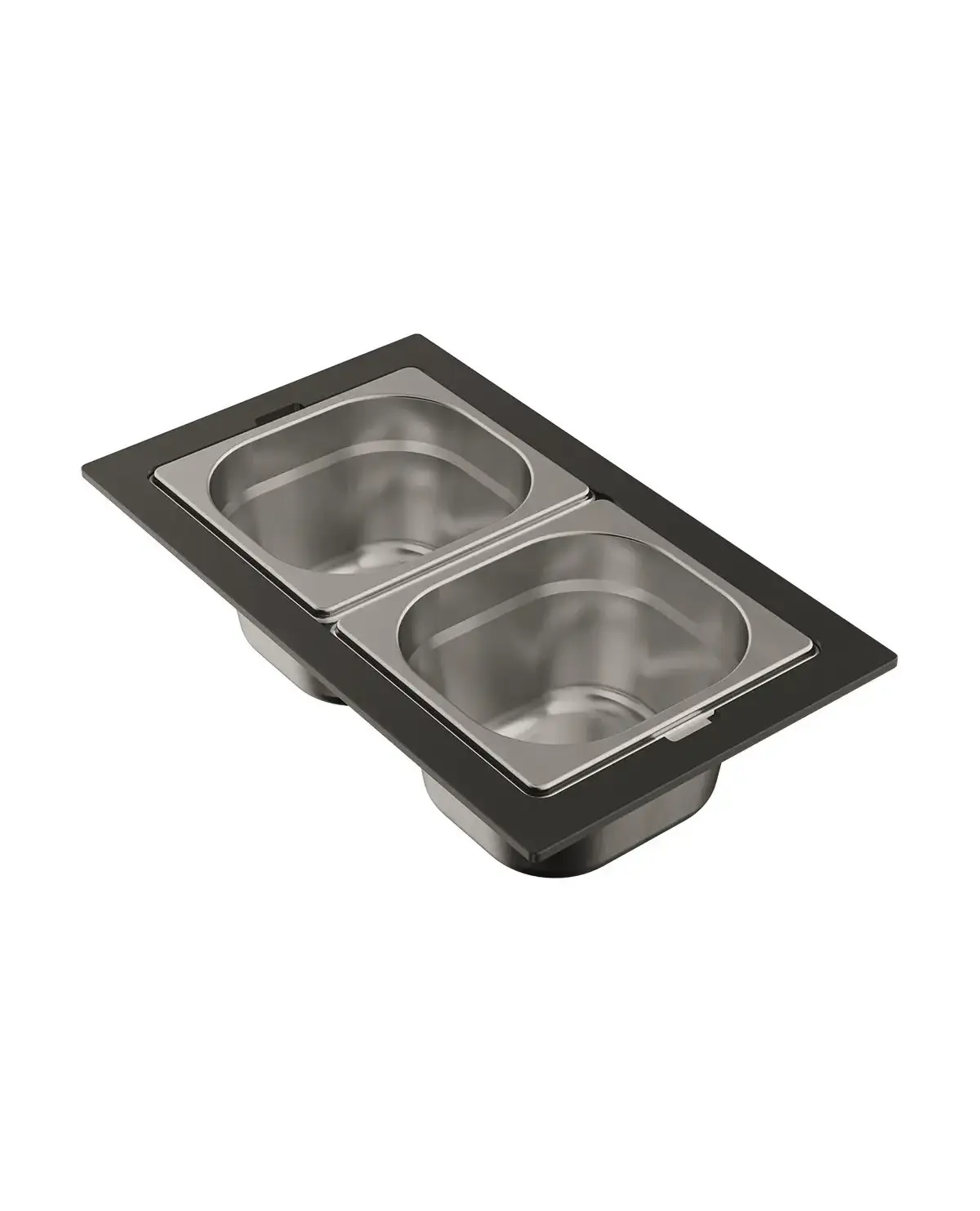 - Чаши свободно вынимаются из пластиковой подставки и перемещаются, а конструкция подставки разработана таким образом, чтобы ее можно было удобно разместить на внутренних ступенчатых направляющих моек: Sintesi 57 и Sintesi 79.