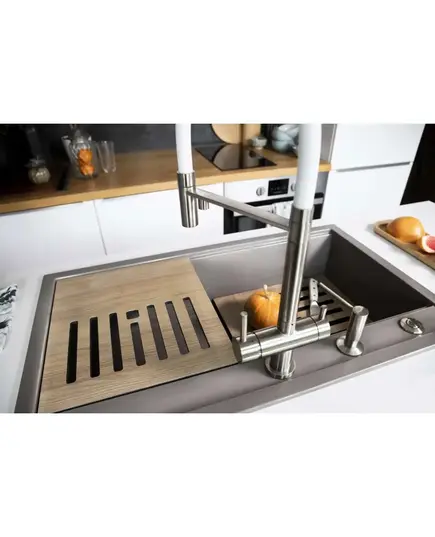 - Гармоничное сочетание мойки, смесителя и разделочной доски идеально дополняют друг друга.