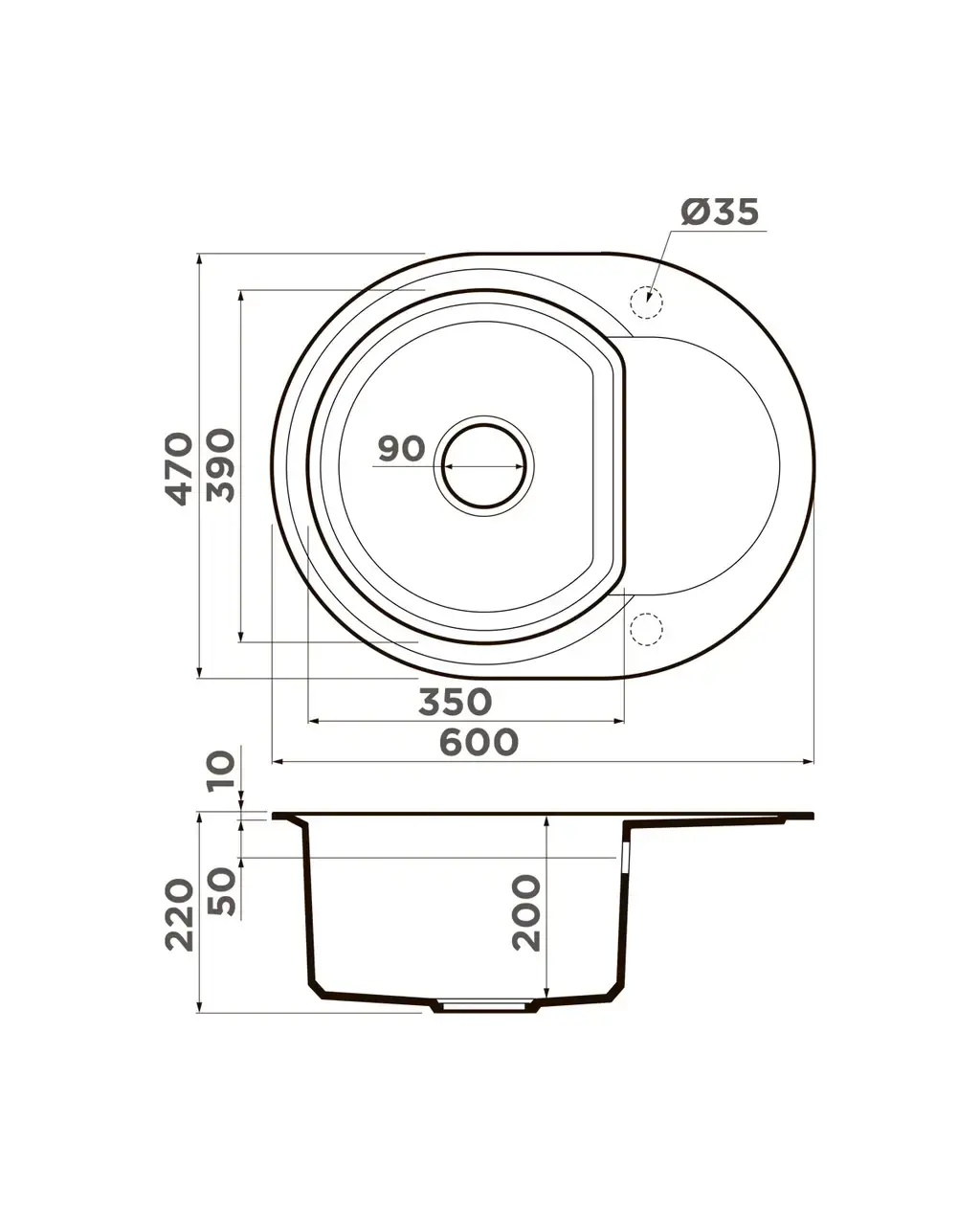 • Габариты мойки 600х470 мм — комфорт для широких столешниц.
