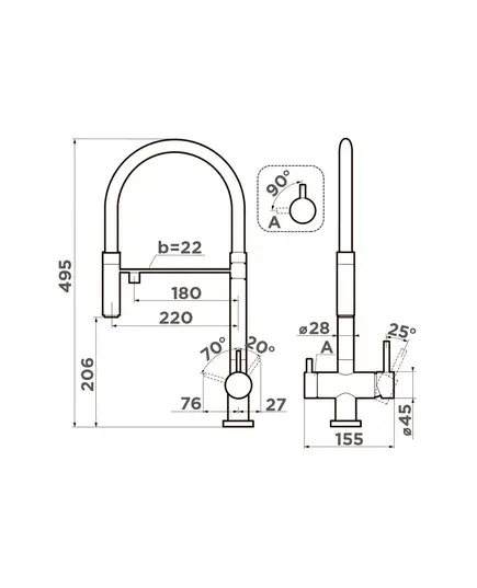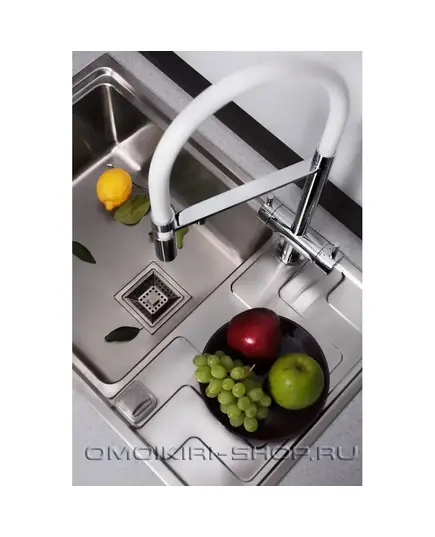 Уникальность смесителя заключается в том, что это единственный на рынке кухонный смеситель который сочетает в себе возможность подключения фильтра для питьевой воды и подвижный излив для горячей и холодной воды, с помощью которого струю можно направлять абсолютно в любую сторону.